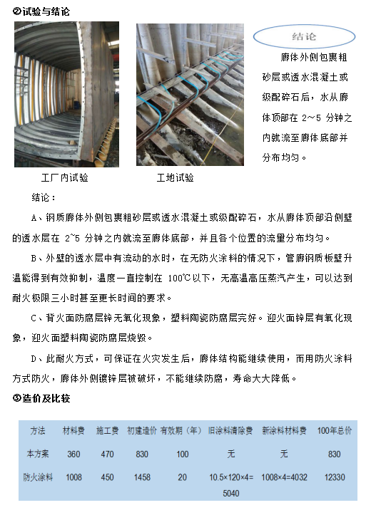 ⑨ 應對耐火極限三小時的方式是涂耐火涂料,但耐火涂料壽命只有 10~20 年, 并且不能長期耐潮,在壽命到期失效后重新涂刷時,由于內部管線及設施的存在, 清除殘余失效涂層的工作量大,涂刷新涂層更繁雜,費用較初次施工時大大增加, 并且在管廊整個壽命周期內要多次更換防火涂層;更為重要的是,耐火涂料只能阻止火災時鋼結構的溫度不高于 550℃,但對于鋼結構地下管廊來說情況特殊,在火災發生半小時左右,耐火涂料覆蓋的鋼結構體溫度就超過 150℃,廊體外部土壤中的水份形成高溫高壓蒸汽,其產生的次生災害有可能嚴重于火災本身。